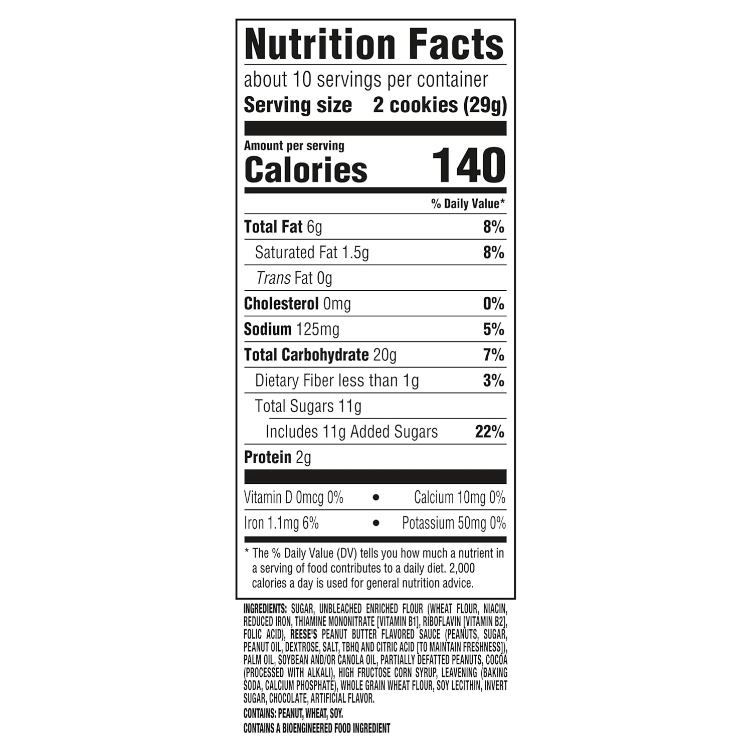 SUGAR, UNBLEACHED ENRICHED FLOUR (WHEAT FLOUR, NIACIN, REDUCED IRON, THIAMINE MONONITRATE [VITAMIN B1], RIBOFLAVIN [VITAMIN B2], FOLIC ACID), REESE'S PEANUT BUTTER FLAVORED SAUCE (PEANUTS, SUGAR, PEANUT OIL, DEXTROSE, SALT, TBHQ AND CITRIC ACID [TO MAINTAIN FRESHNESS]), PALM OIL, SOYBEAN AND/OR CANOLA OIL, PARTIALLY DEFATTED PEANUTS, COCOA (PROCESSED WITH ALKALI), HIGH FRUCTOSE CORN SYRUP, LEAVENING (BAKING SODA, CALCIUM PHOSPHATE), WHOLE GRAIN WHEAT FLOUR, SOY LECITHIN, INVERT SUGAR, CHOCOLATE, ARTIFICIAL FLAVOR. CONTAINS: PEANUT, WHEAT, SOY.