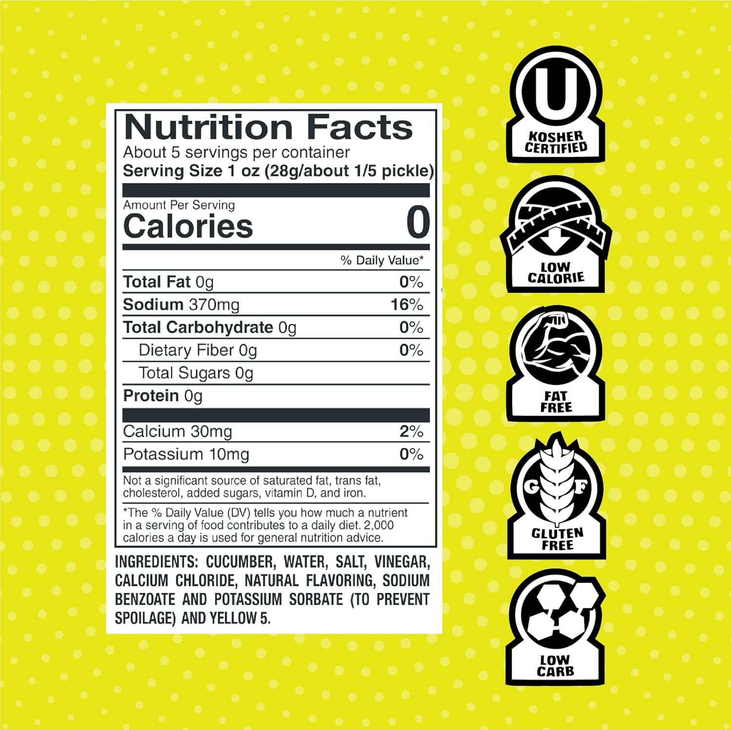 Cucumber, Water, Salt, Vinegar, Calcium chloride, Natural flavoring, Sodium benzoate and potassium sorbate ( to prevent spoilage), and Yellow 5.