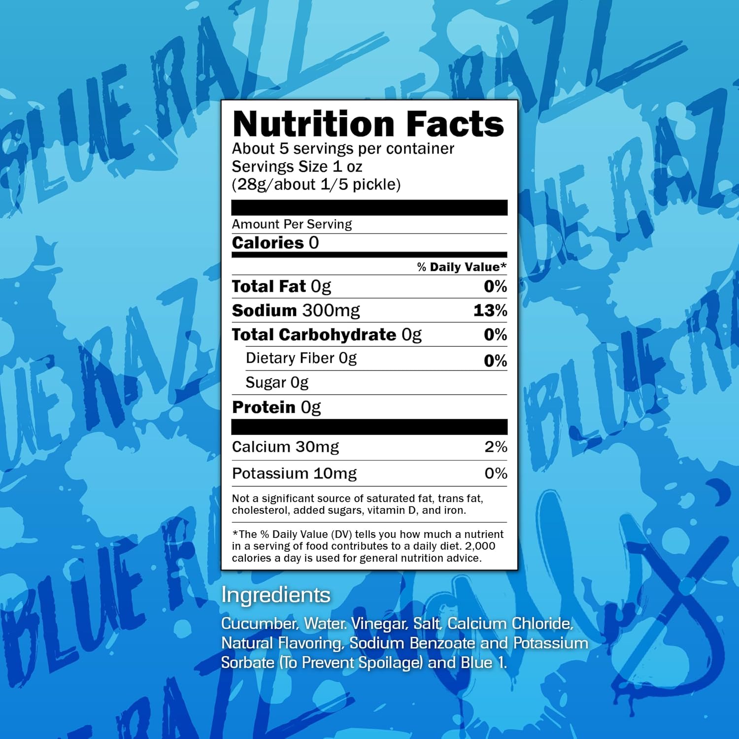 Cucumber, Water, Vinegar, Salt, Calcium Chloride, Natural Flavoring, Sodium Benzonate and Potassium Sorbate (To Prevent Spoilage), And Blue 1